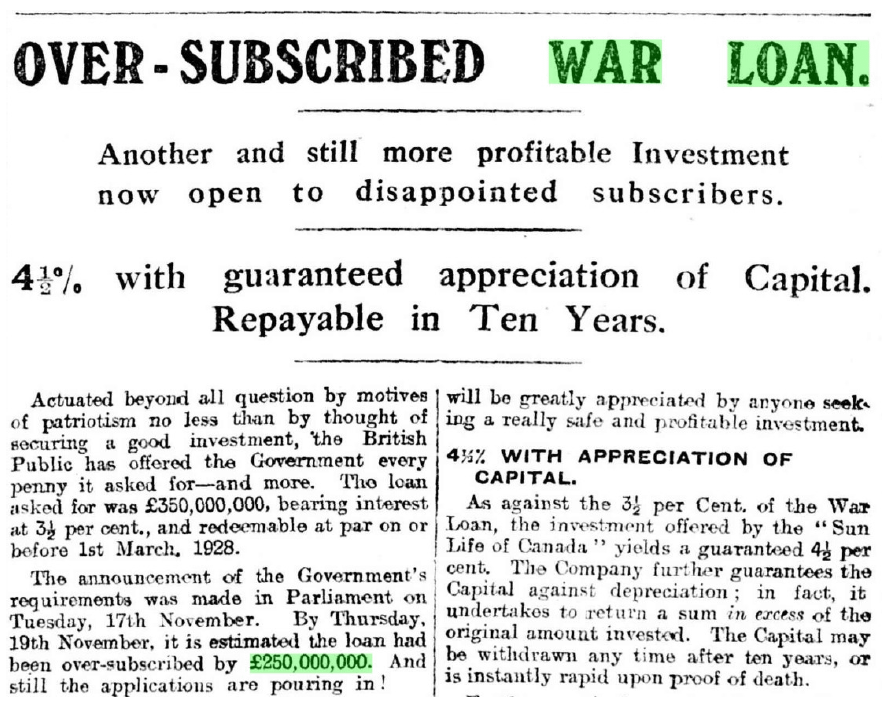 קצת רקע - בשנת 1914, נדרשה ממשלת בריטניה לגייס סכום עצום במונחים של אז, 350 מיליון ליש"ט, סדר גודל של התוצר *השנתי* של בריטניה באותן השנים. מטרת הגיוס הייתה כמובן מימון דחוף של הוצאות הקשורות להשתתפות של הבריטים במלחמת העולם הראשונה.