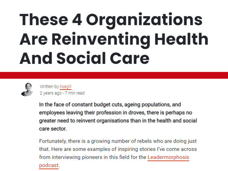 En este sentido la lectura de Laloux resulta muy interesante porque facilita numerosas prácticas que podrían adaptarse a nuestro entorno y describe ampliamente cómo es un ejemplo de organización sanitaria autogestionada: Buurtzorg.