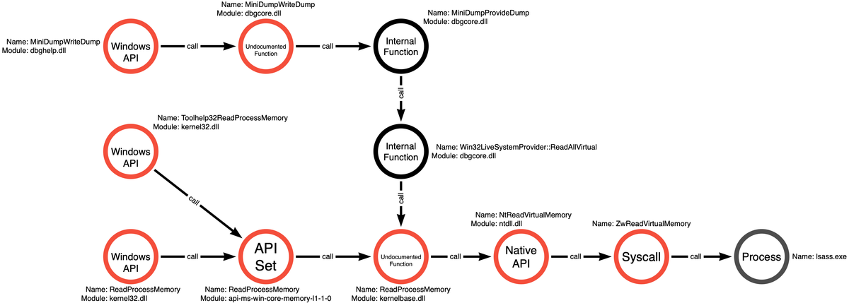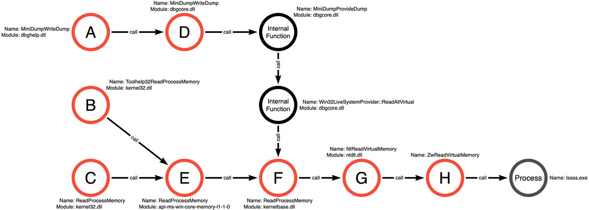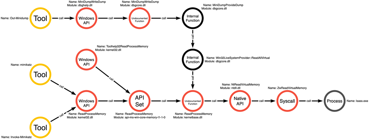 1/ In a previous thread I introduced an idea I call function call graphing. The goal is to represent all of the ways that an adversary could achieve a specific action (Process Read in this case) through APIs. Let's talk through one potential defensive use case.
