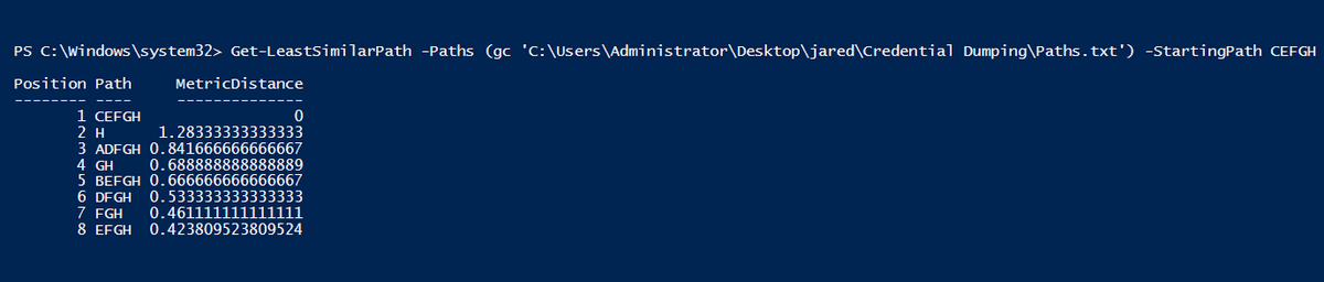 31/ As you probably are already thinking, this calculation can be applied recursively to rank order all paths. I wrote a script called Get-LeastSimilarPath to do just that. If we had to pick only 3 of 8 possible paths, we'd choose CEFGH, H, & ADFGH to maximize our coverage.