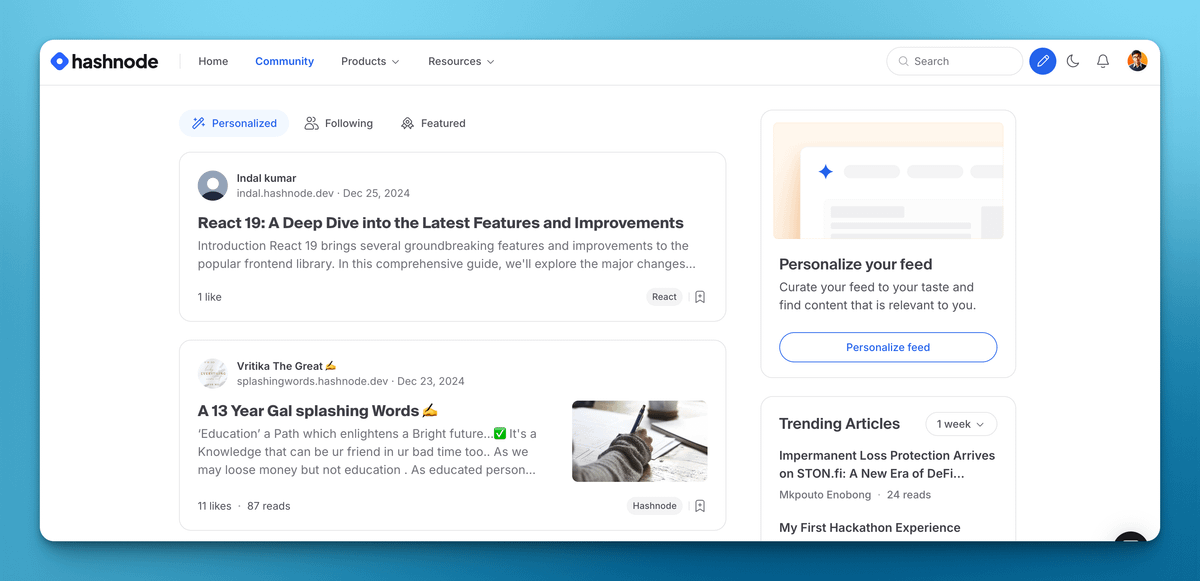 Hashnode本身就是一个专门写博客的网站,所以你写的内容默认就可以在Hashnode社区内供别人阅读。 Hashnode社区还是比较活跃的,界面不输Medium,功能比DEV comunity强,个人感觉后续要进行内容创作的话,这3个平台最好都搞起来。
