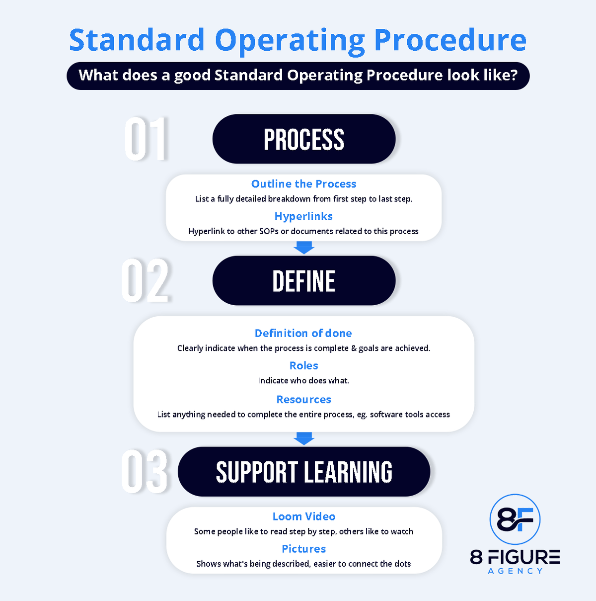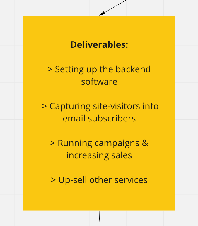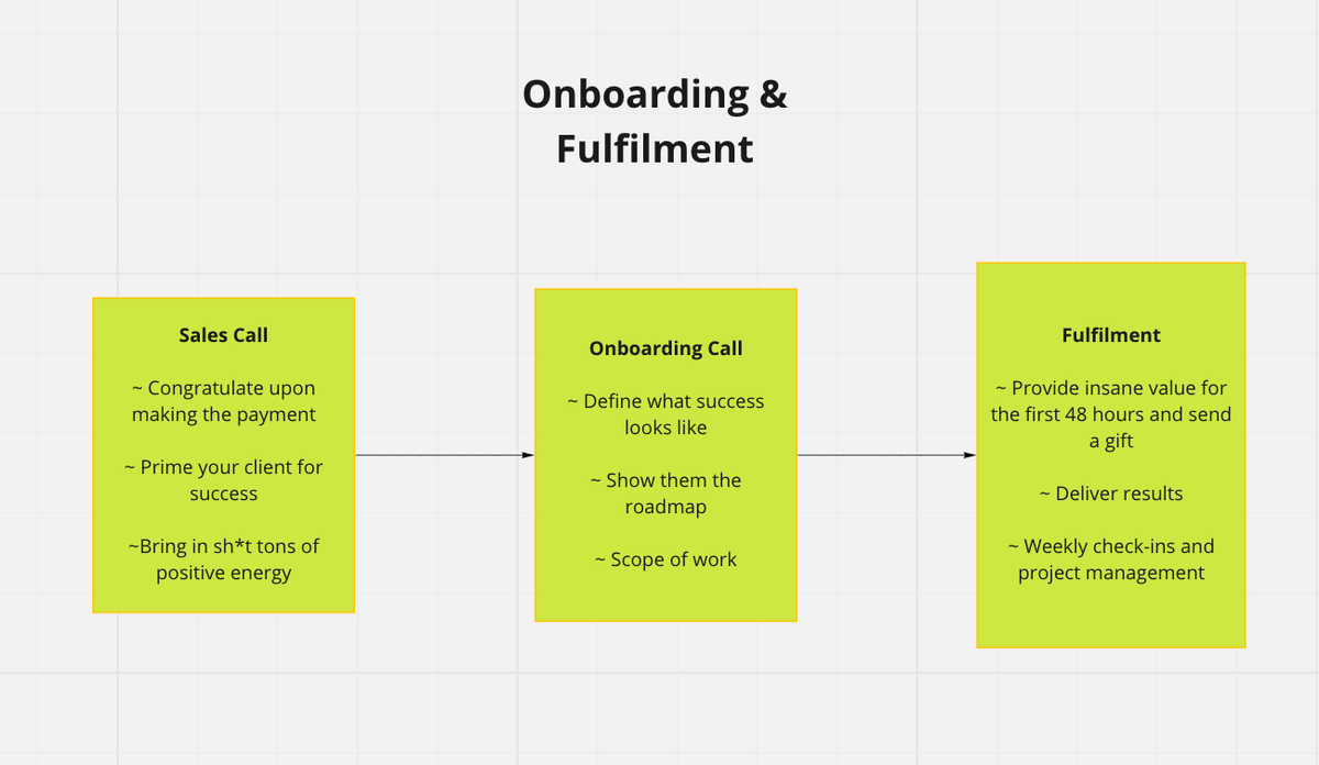 From outreach & attending sales calls to client onboarding, and project management, every single step needs to be clearly explained.