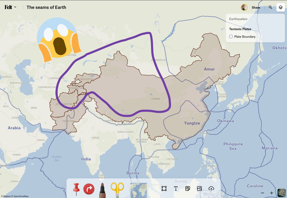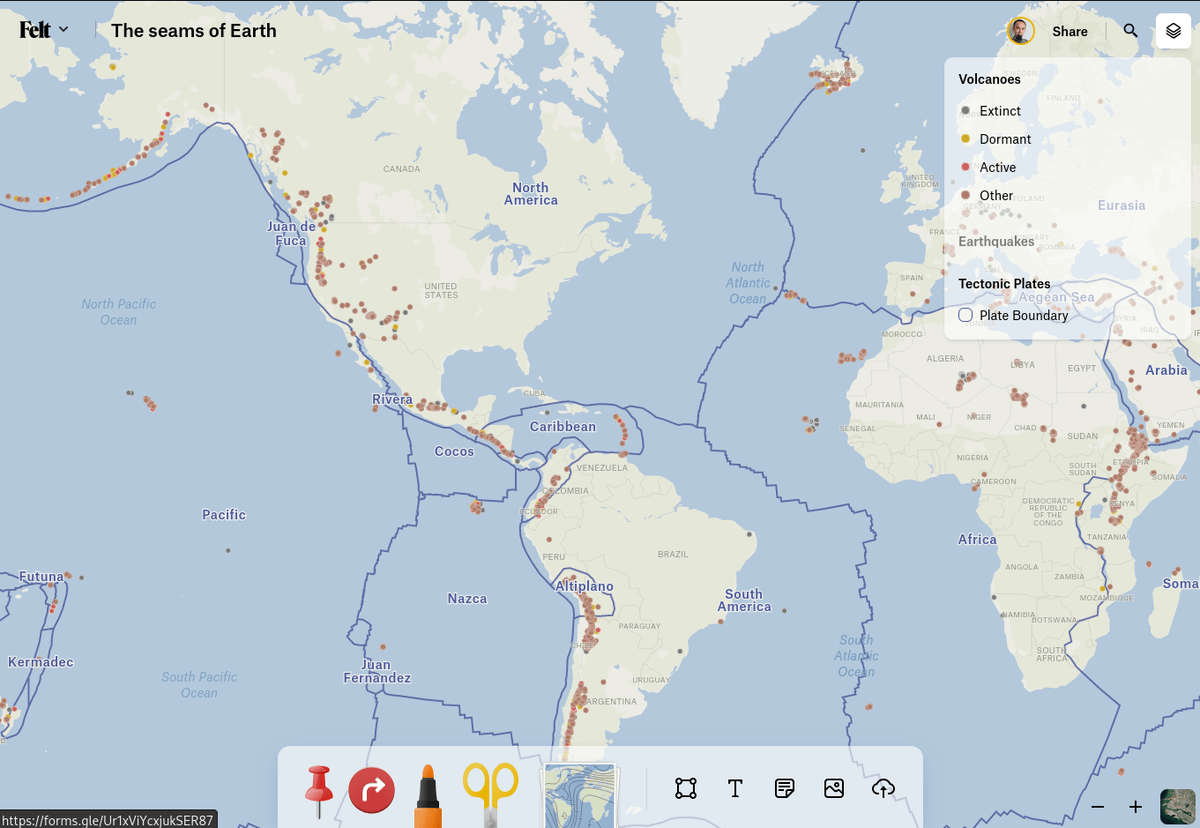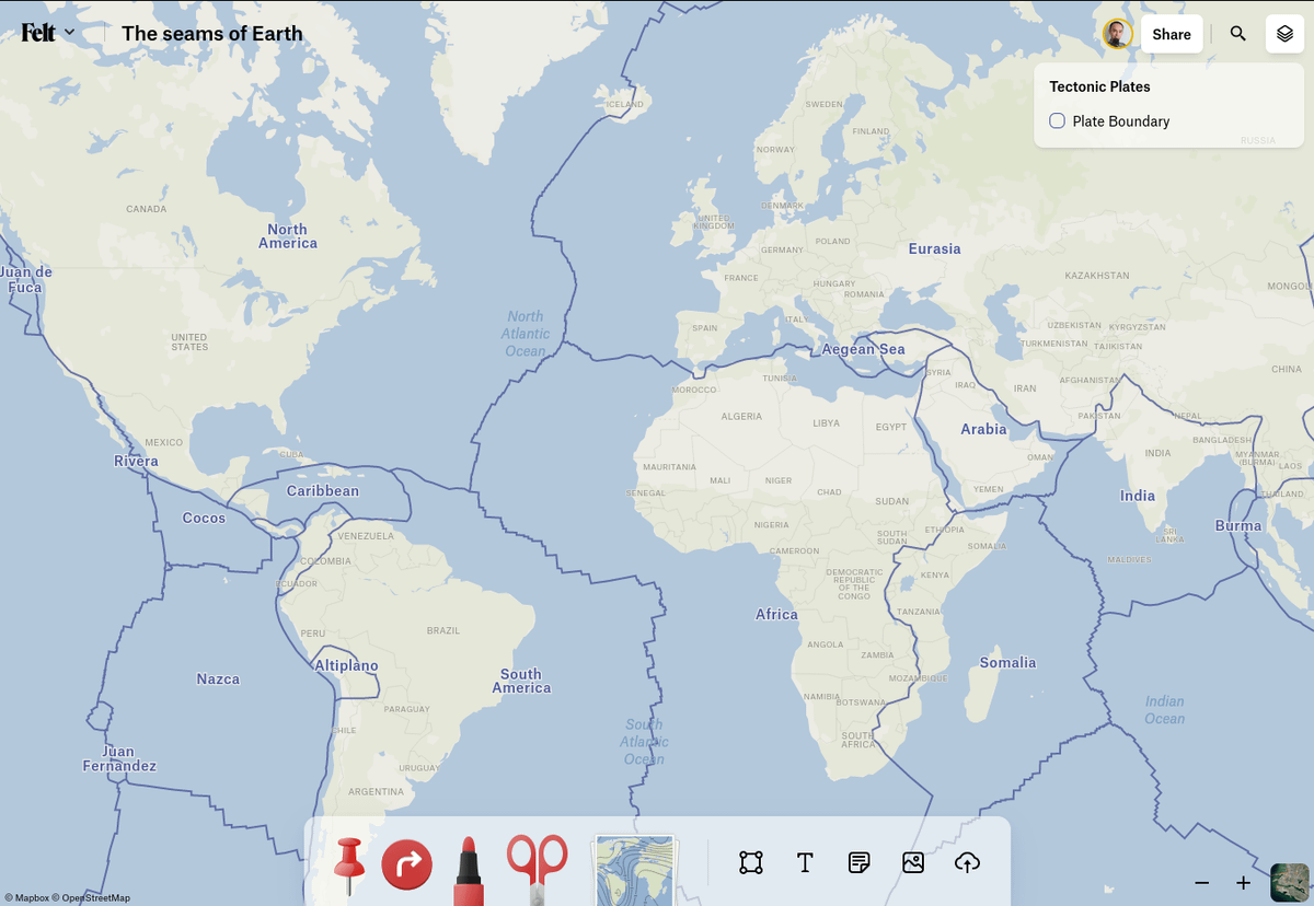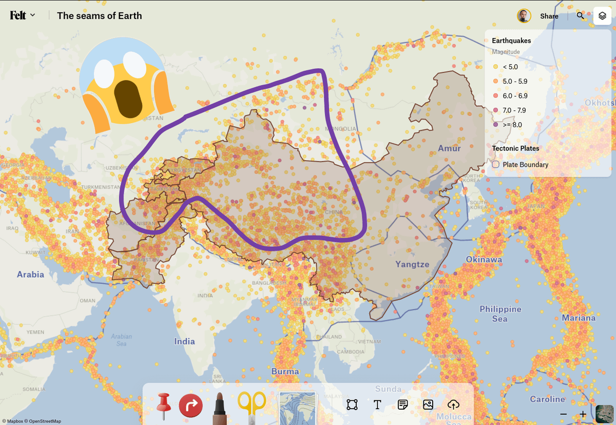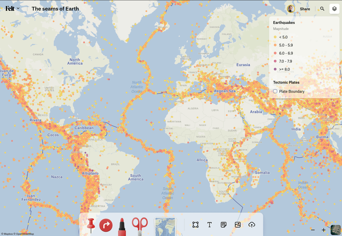 Maps are a blank canvas on steroids, showing places, distances, (cor)relations… They're powerful communication tools if you're enabled to use them liberally. I love throwing data on top of maps and looking for patterns🕵🏻. I did an exercise on the seams of Earth, tectonic plates!
