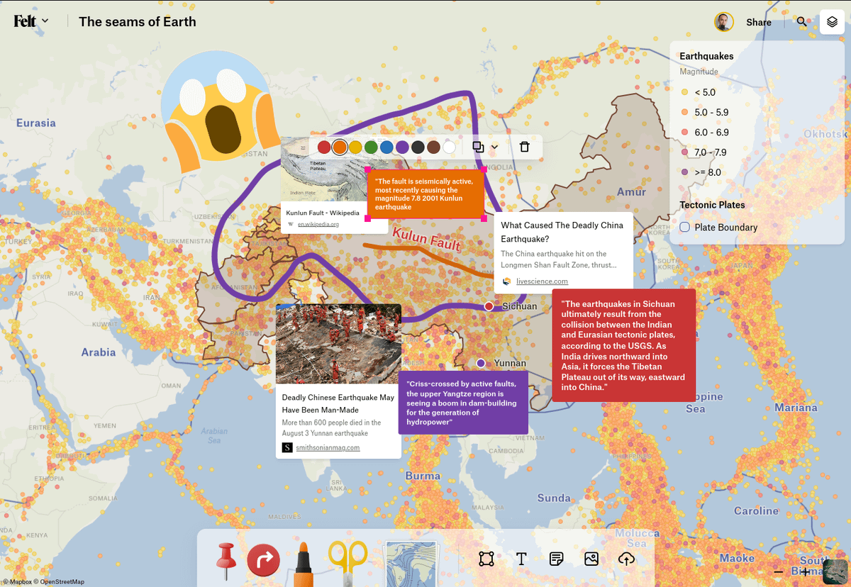 There’s a countless amount of layers to stack on top of a map! Crime and social investment? Earthquakes and fracking? At Felt, we want both to provide as many useful layers to users but also allow them to load and play with their own. Join! felt.com/