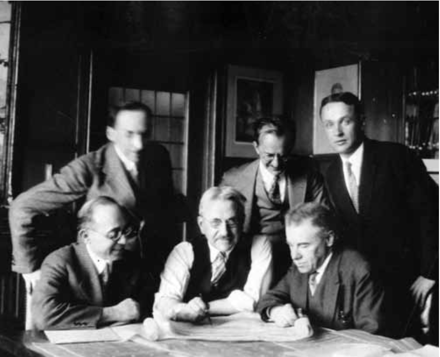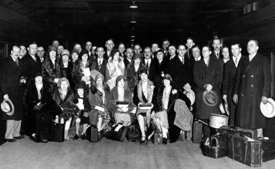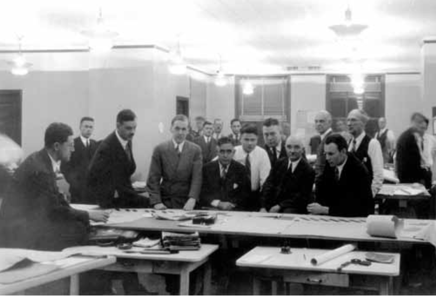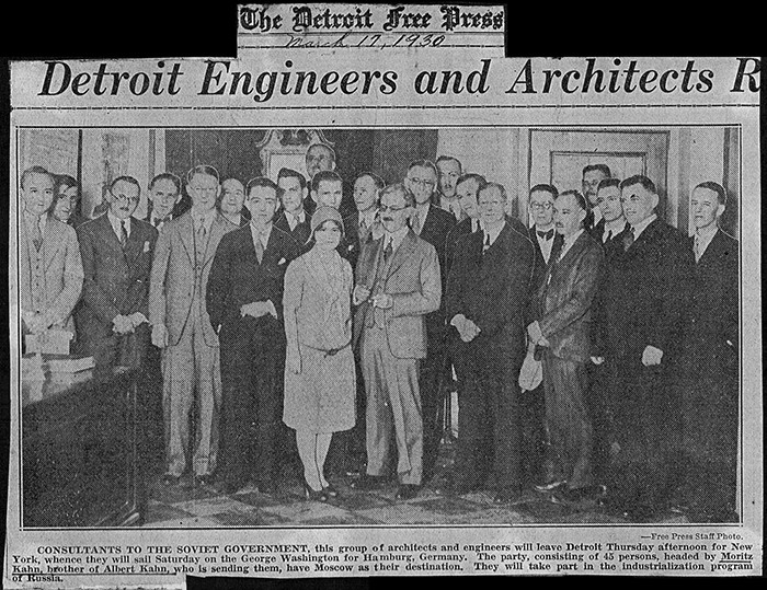 Initially the work was conducted from the Detroit office. Later, much of it was transferred to Moscow office where it was done with assistance of the Soviet staff whom Americans instructed and supervised. Here you see Moritz Kahn and his engineers departing to the USSR in 1930