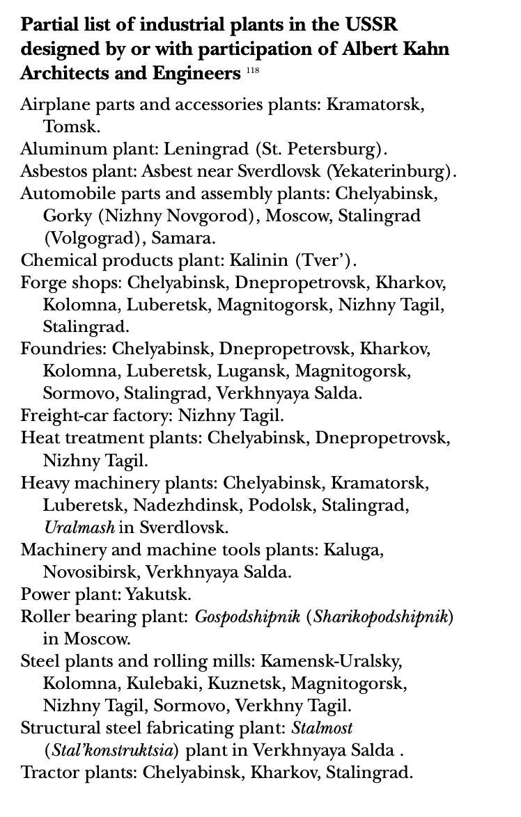 That's a partial list of some largest plants Kahn designed. After Kahn engineers departed, they left their blueprints, calculations, and specifications. They left-American trained Soviet experts who could use these models and emulate them with minimal changes (привязка)