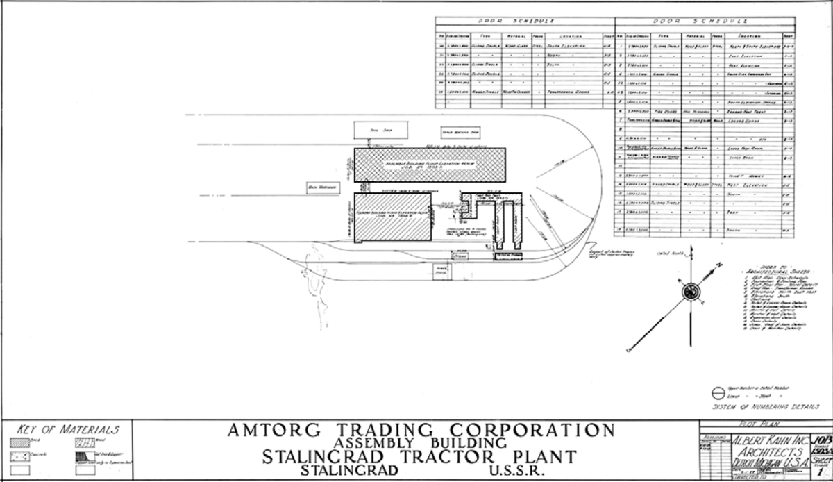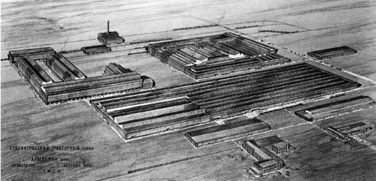 In 1929 Albert Kahn Associates secure a mega contract on designing and supervising construction of the Stalingrad tractor plant. It was modeled after the International Harvester Milwaukee plant. Kahn prepared architectural and engineering drawings including road & railroad access