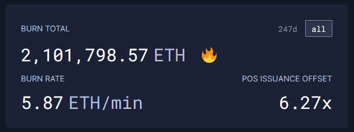 So far, more than 2M ETH has been burned in 8 months. That's almost 6 ETH/min! At this burn rate, ETH supply would shrink by 2.2% every year.