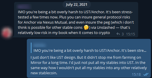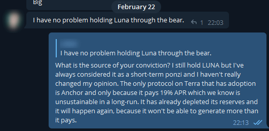 I expressed my lack of confidence in $UST and $LUNA in various private groups I'm in, e.g. @DeFiOmega: