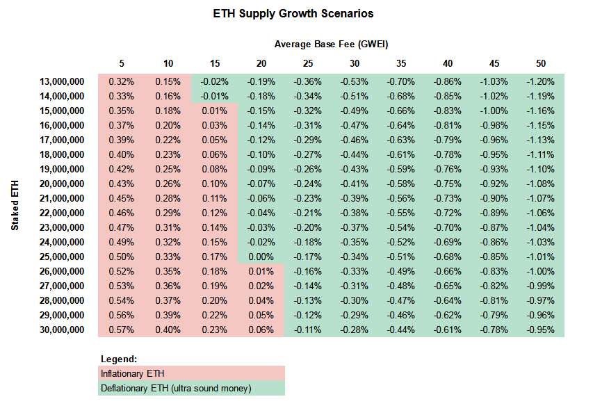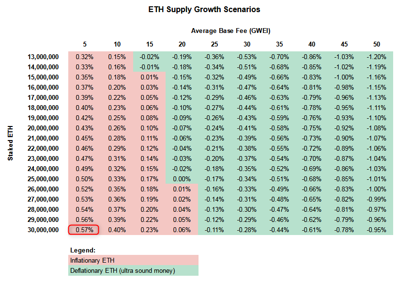 The below table shows the annual $ETH supply growth for different levels of staked ETH and Average Base Fee.