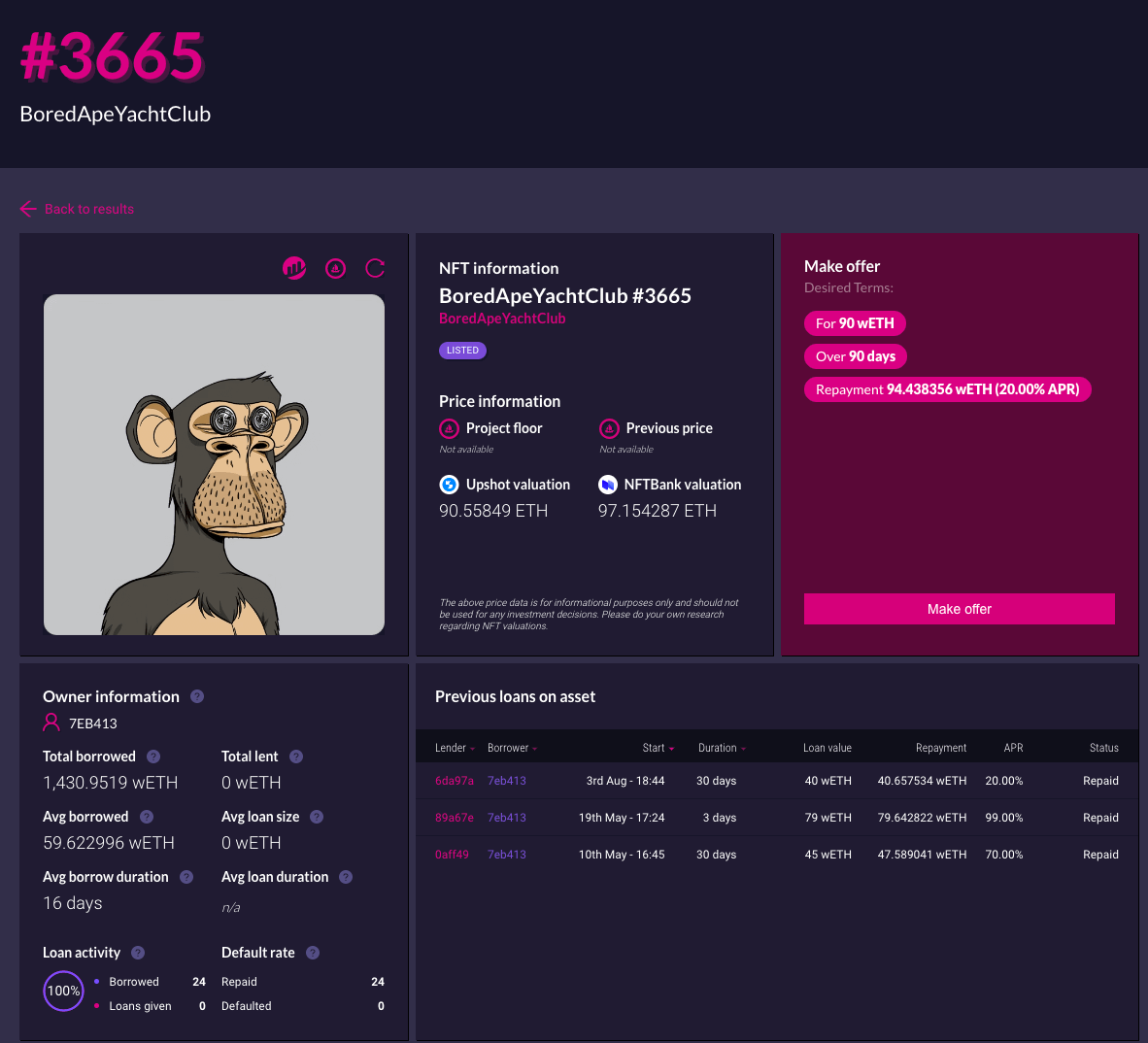 Eg in the pic below, the borrower is requesting 90 WETH and would have to repay 94 ETH in 90 days or the lender keeps the BAYC