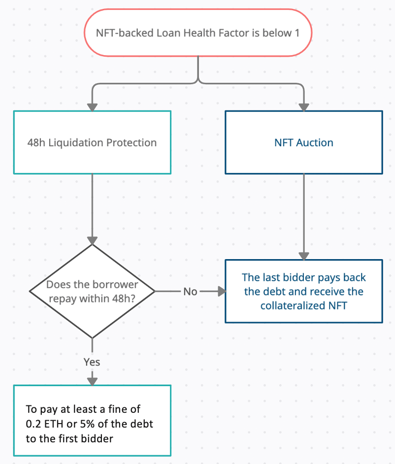 The liquidation process is forgiving on BendDAO as there's a 48-hour delay between the liquidation and sale or top-up (vs just being market dumped like in DeFi).