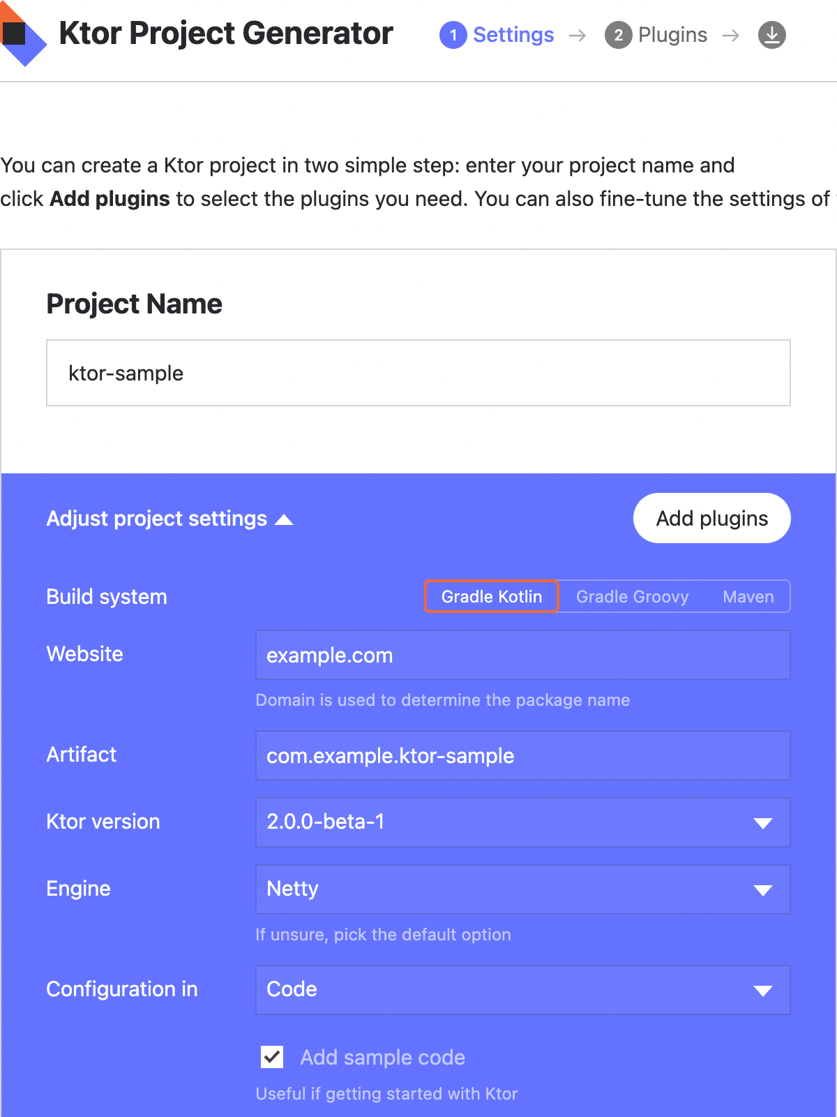 Define the app name, package name, ktor version, the engine used and what plugins you need.