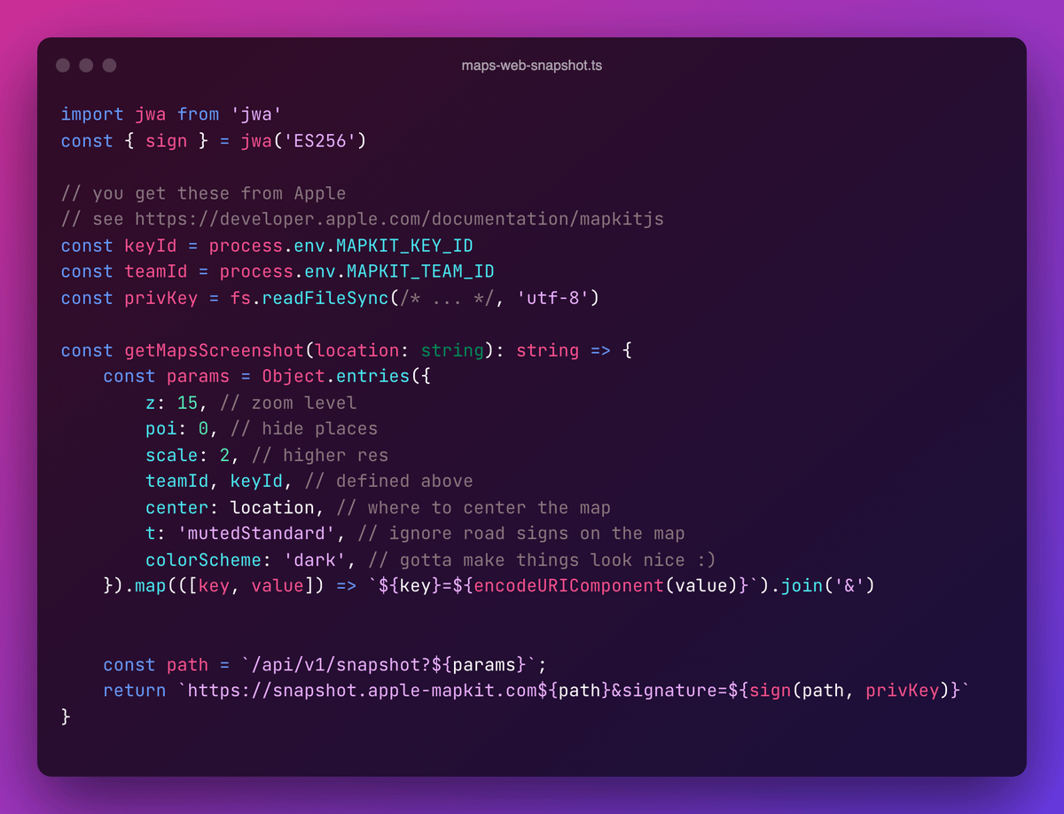 You just need to build a URL with your desired options (where to center the map around, level of zoom, dark mode, etc.), sign it with a key Apple gives you, and you're set!