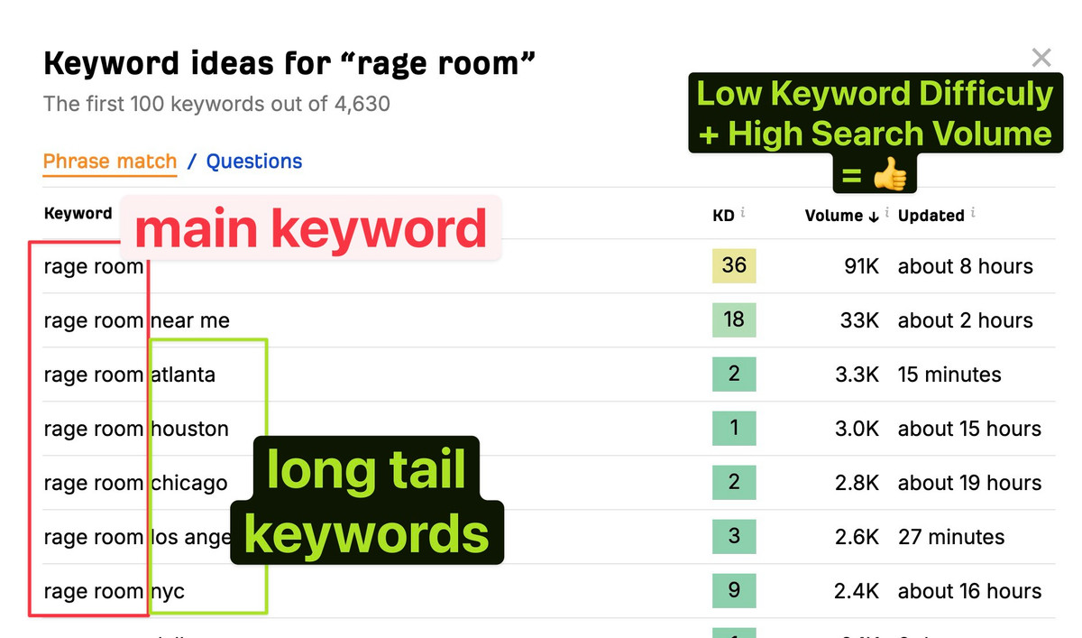 There’s a high volume for “rage rooms in [city]” and a low KD. Let’s build for these keywords.