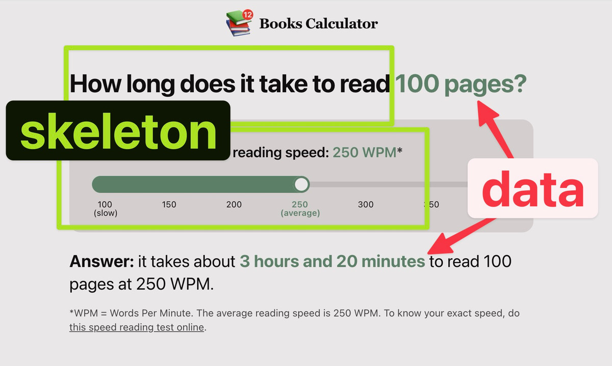 My site BooksCalculator has 100+ pages ranking for “How long to read [pages_number]?”