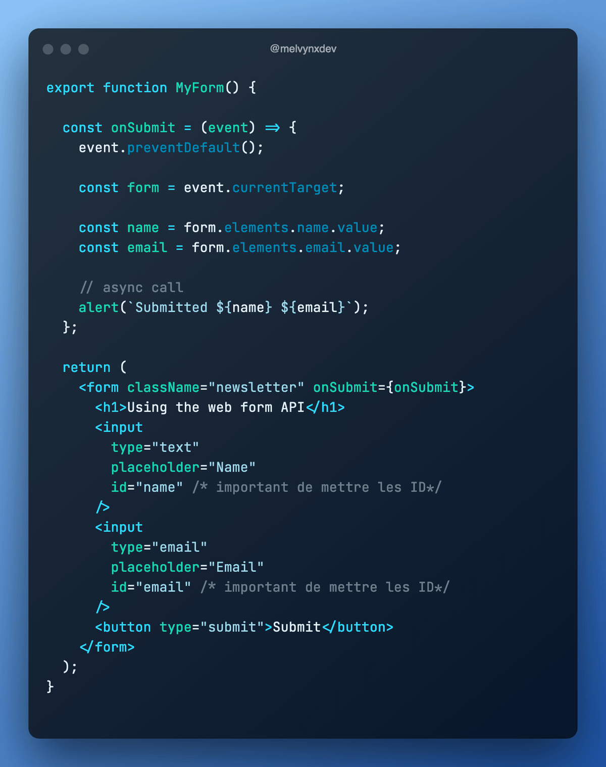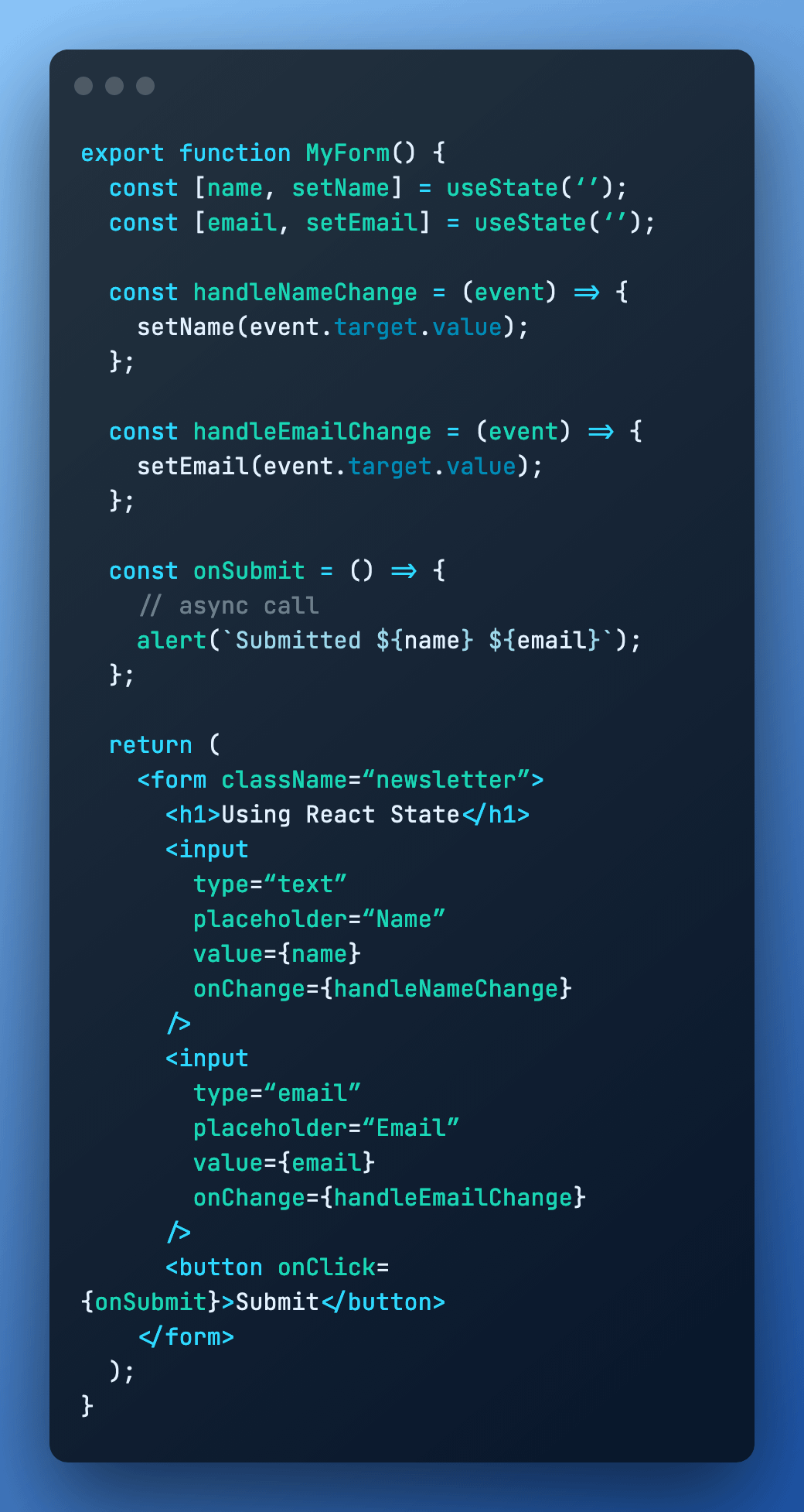 âą les events handler (handleNameChange, onSubmit x2)