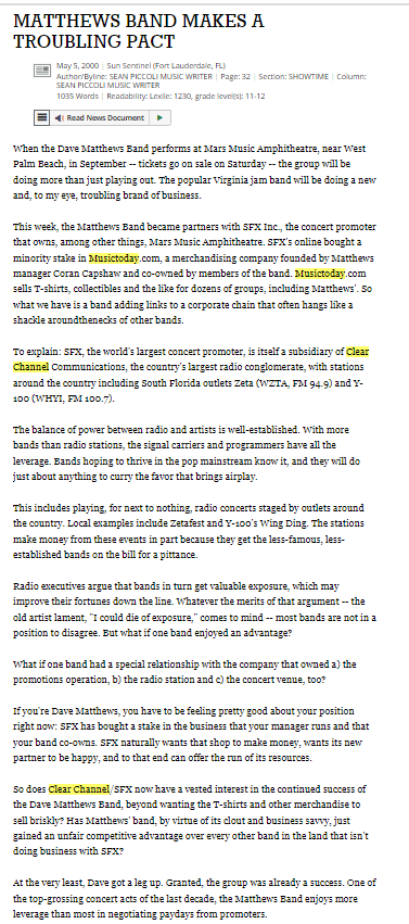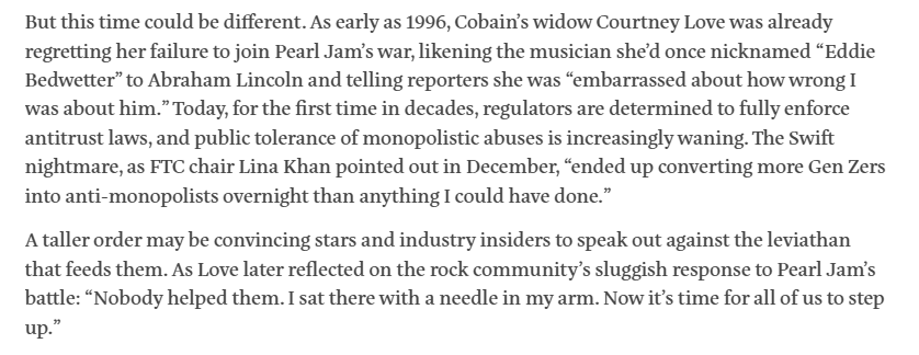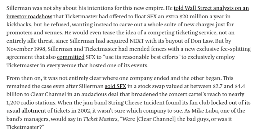 Ticketmaster's victory over Pearl Jam & the Telecom Act of 96 unleashed a tsunami of music consolidation. By 2000 TM was essentially an offshoot of an empire that controlled 1000s of radio stations & billboards, 100s of venues & even 100s of musician FAN CLUBS (thanks to his guy)