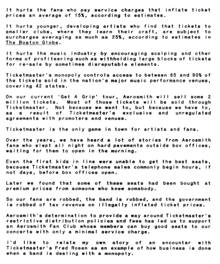 Instead, Ticketmaster offered to pay them an extra dollar per ticket, Aerosmith's manager testified before Congress.