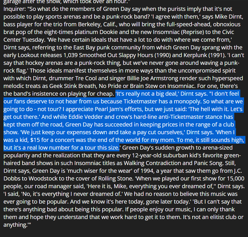 One of Ticketmaster's shrewdest moves in its war on Pearl Jam was enlisting @GreenDay who essentially advised Vedder to take a "pay cut" & even @IanMacKaye who said he didn't think TM's Fred Rosen was a "bad guy" but the product of a "bad system"