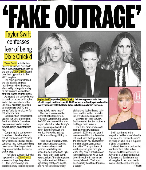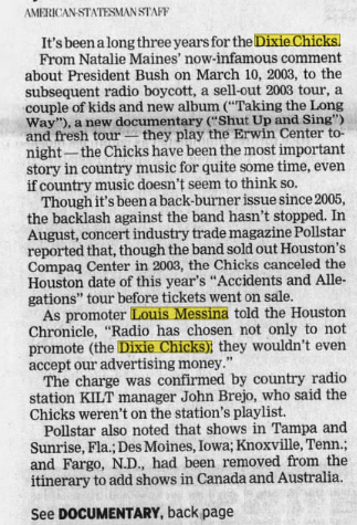 Taylor Swift, who shares the Chicks' concert promoter Lou Messina -- who had sold out to/left/sued Clear Channel in 1999-2000 -- said the band's blacklisting had "terrified" her as a young fan.