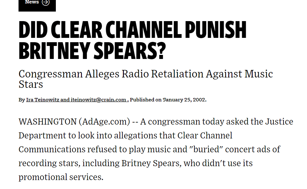 But Clear Channel did not sabotage artists solely for political reasons. When Britney chose (Messina backer) AEG to promote a tour in hopes of boosting her (sigh) film career, CC removed her songs from playlists, inviting a DOJ "investigation" that SOMEHOW never amounted to much.