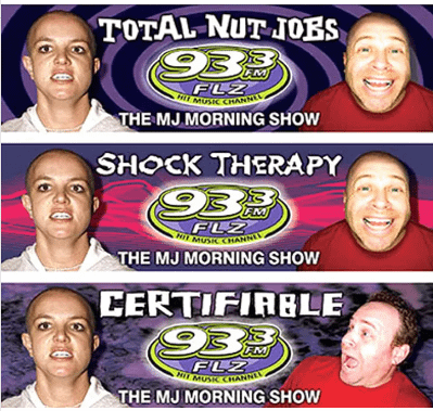 Clear Channel continued to terrorize Britney though, airing a hoax account of her "death" in grisly a car crash & later taking out billboards with photos of her manic head-shaving episode to advertise its "crazy" morning shows...