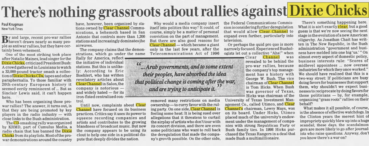 In 2003 Clear Channel was 1 of the most powerful companies in America, the Dixie Chicks were 1 of the most popular bands & George Bush invaded Iraq for reasons that are still unknown but basically boil down to Epic Deep State Cash Grab.