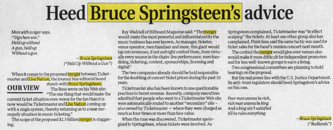 What could possibly make this system worse? Only one thing, according to The Boss: the merger of these two symbiotic concert vampires