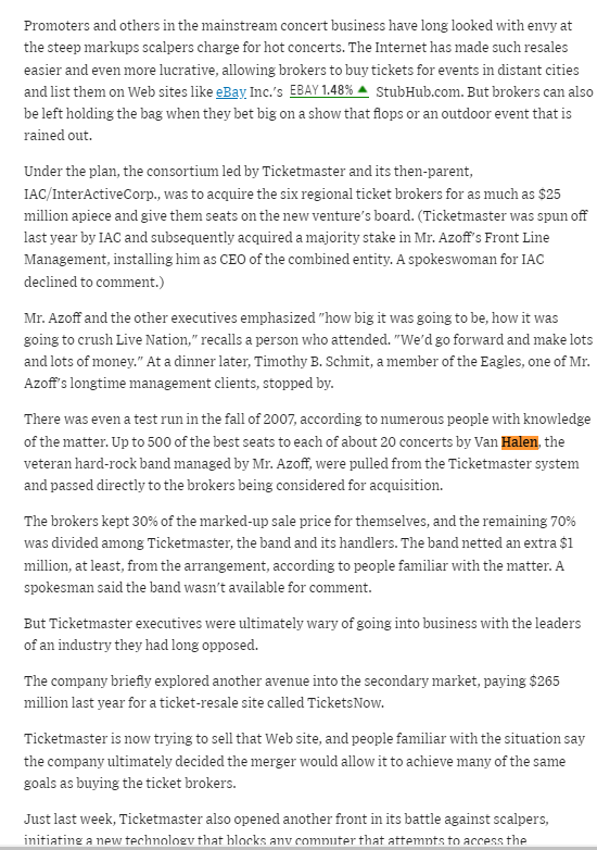 Meanwhile, Ticketmaster was doubling down on new forms of gouging. It bought off regional ticket brokers, teamed w/ @vanhalen to sell off their best tix to scalpers & split the profits, & rigged systems to direct fans to scalped tickets even if primary tix were still available