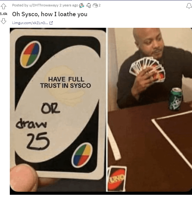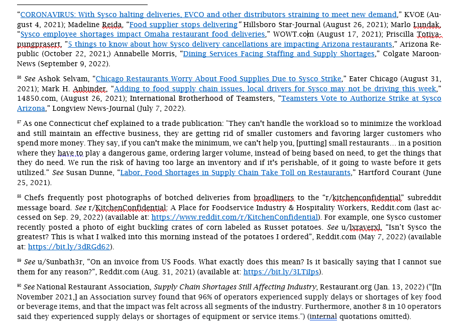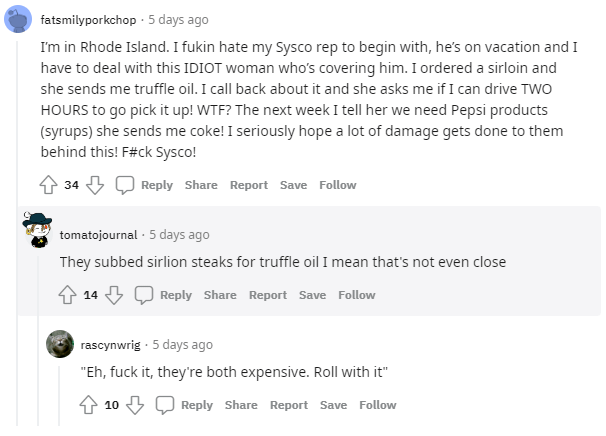 Meanwhile in the kitchen trenches, TOTAL CHAOS reigned. Last year restaurants were regularly getting orders 2-3 DAYS late if at all. Whole counties were unilaterally wiped off delivery routes. Because Sysco liked how its "lean" labor force looked on a spreadsheet.