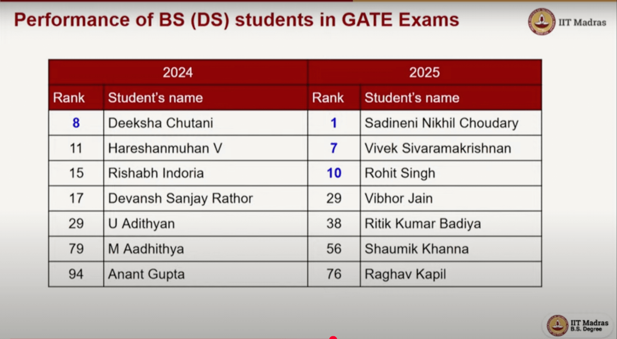 I'm not sure what are good proxies for performance/legacy, especially for a program that's just started. But if it's any indication, a chunk of the top GATE rankers were students of the BS/DS program.
