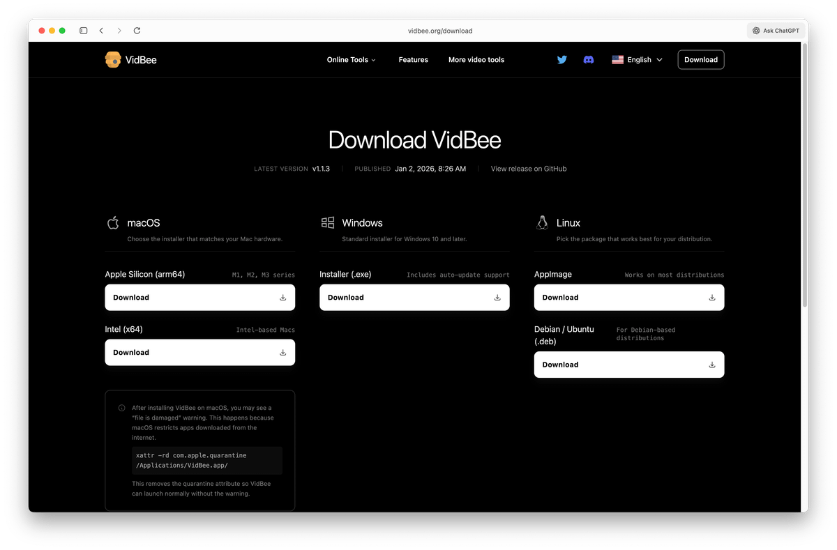 New VidBee Download Page Download VidBee for multiple platforms