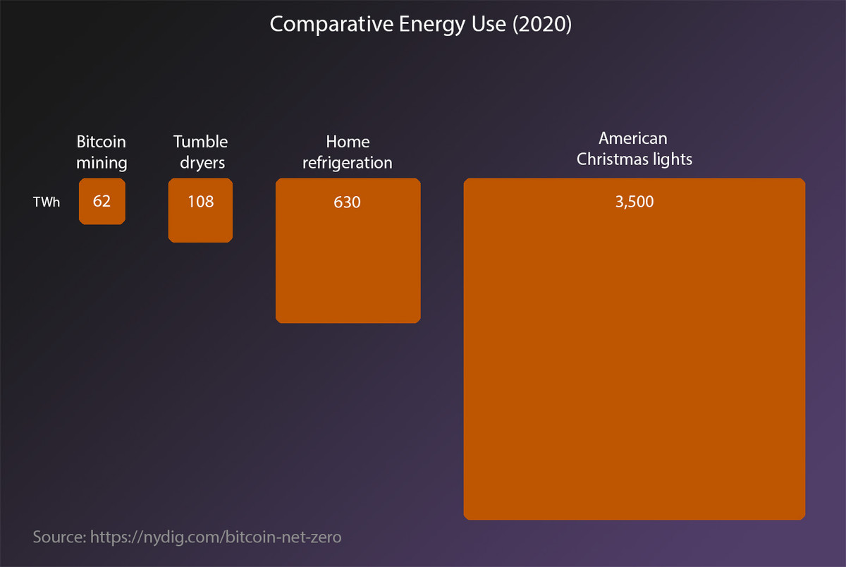 As you can see above, Bitcoin mining used slightly less energy than domestic tumble dryers and only a fraction of the energy used by American Christmas lights.