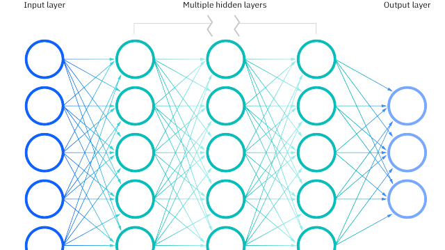 31/ Your input is cut into bits or small numbers and fed into each of the nodes (aka "neurons") in the "input layer". These are connected to all the nodes in a second "hidden" layer.