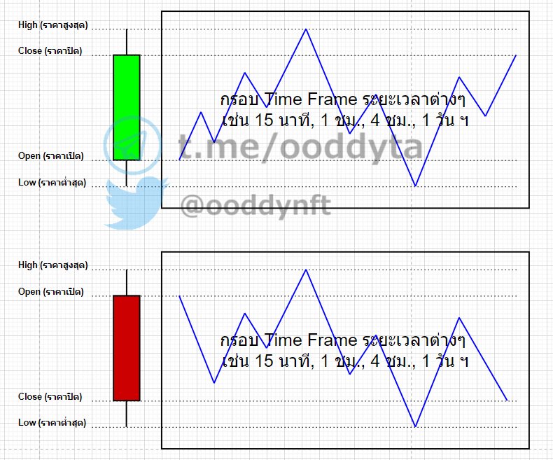 (4) แท่งเทียน เทียบกับ กราฟเส้นตรง ได้ยังไง ตามรูปใน (2) จะเห็นระดับราคาต่างๆ ตั่งแต่ ราคาเริ่มเปิด ราคาวิ่งไปจุดสูงสุด ต่ำสุด จนราคาปิด ตามระยะเวลา (แกน x) กราฟเส้นตรงของจริงไม่จำเป็นต้องวิ่งตามรูปเสมอไป แต่เมื่อจบกรอบระยะเวลาแล้วจะถูกย่อให้กลายเป็นแท่งแทียนตามนั้น