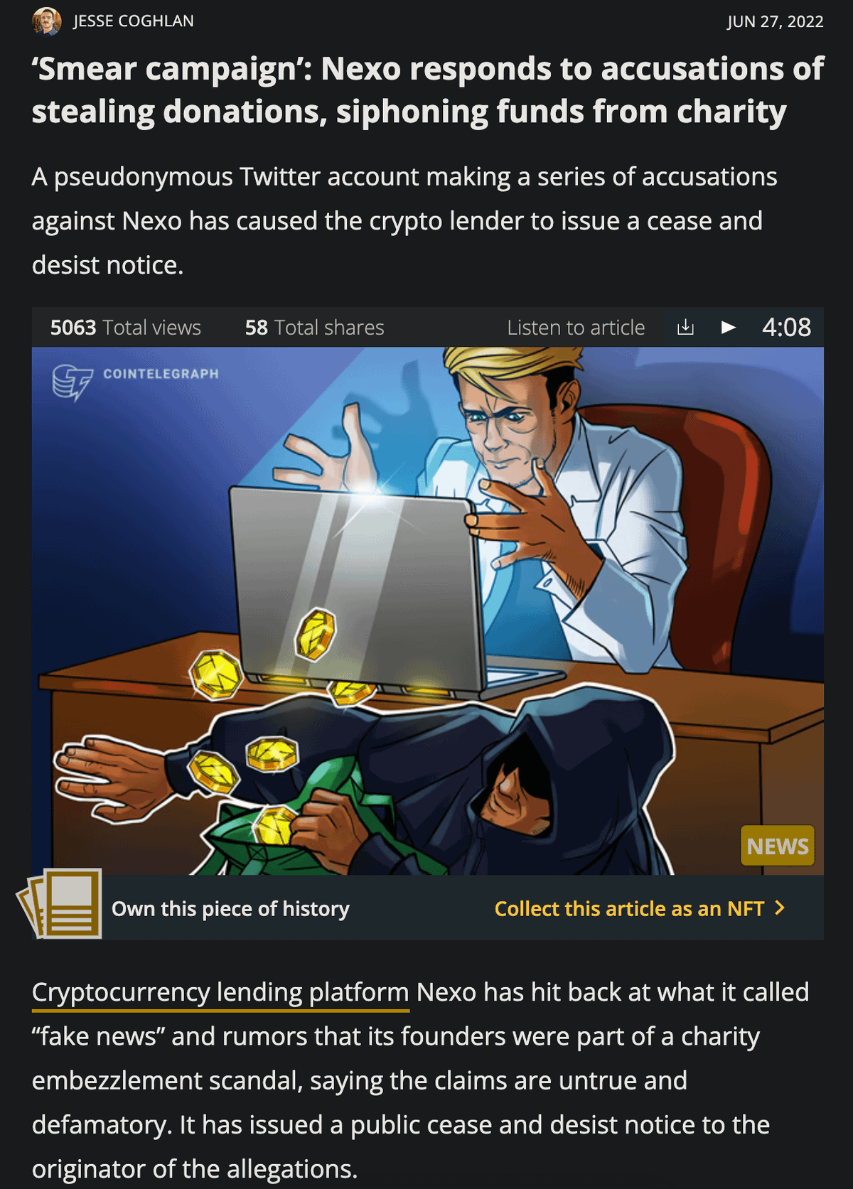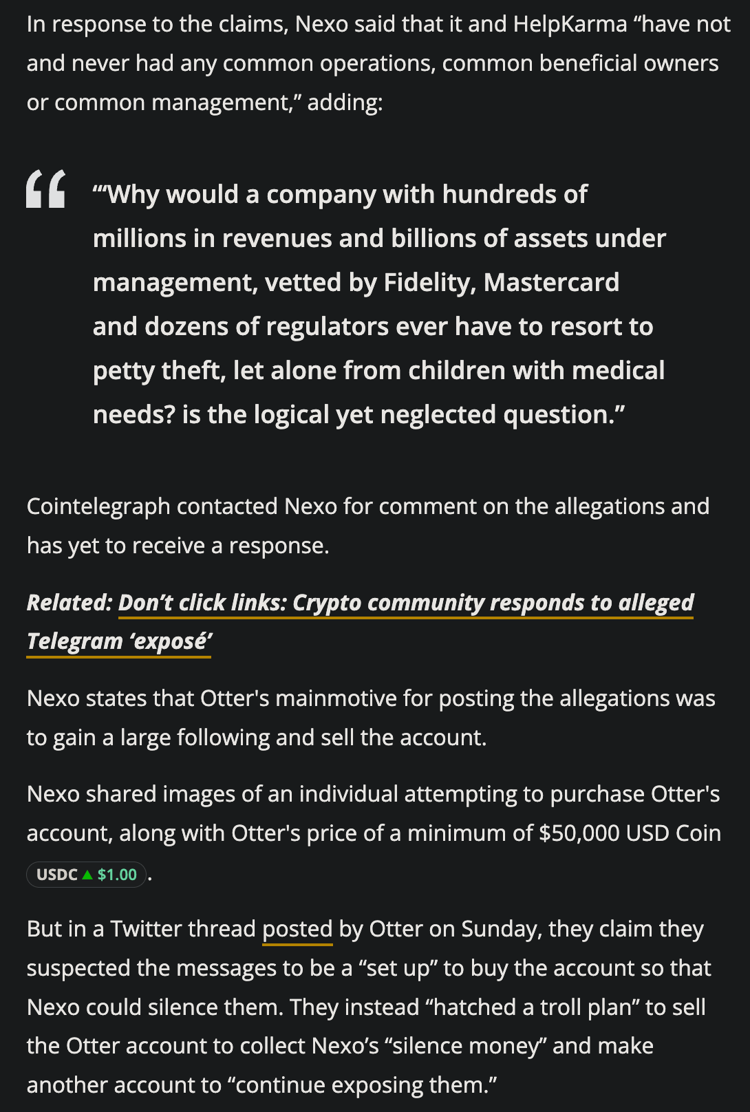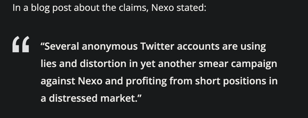 the article reads like a paid Nexo piece with strong emphasis on Nexo's response
