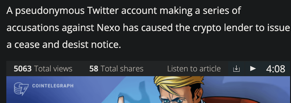 perhaps Nexo is playing up their relationship with Cointelegraph?