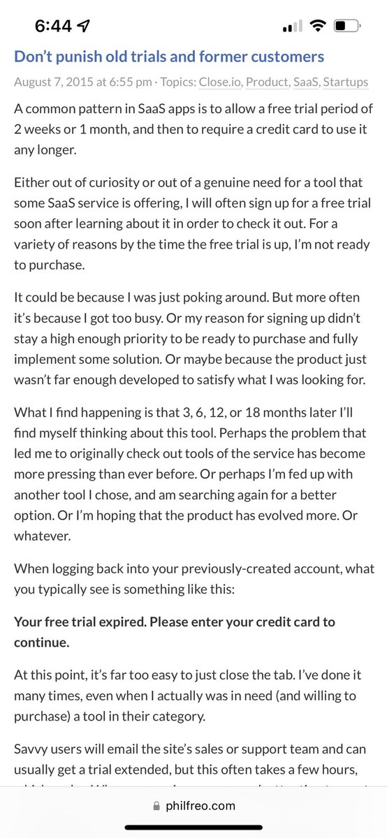 If your product is good, you want to maximize the chance of people actually getting to the aha moment before hitting a paywall. twitter.com/philfreo/status/1548704988100173825