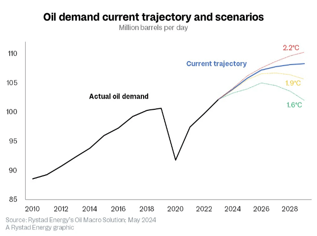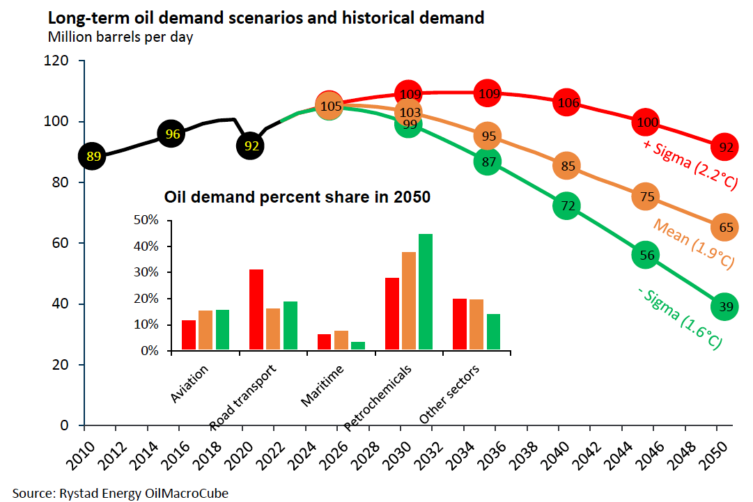 Global oil demand will rise a few MM b/d to 2030, peak, then quickly fall in 2 of 3 scenarios. My money's on the middle scenario.