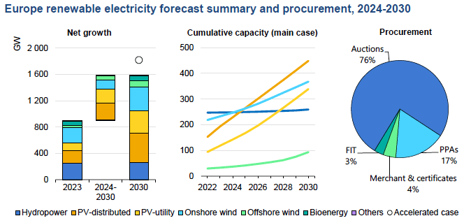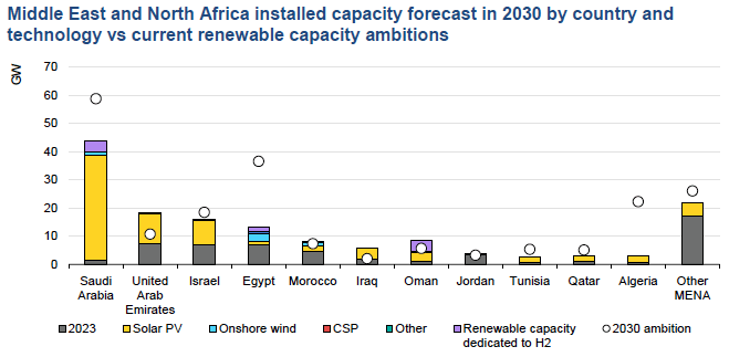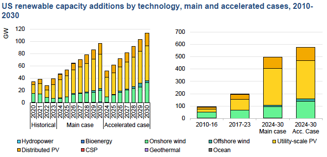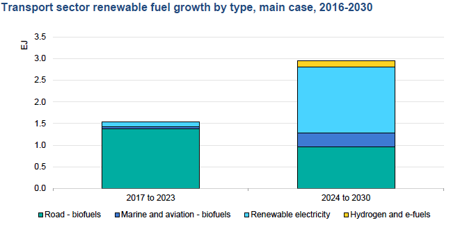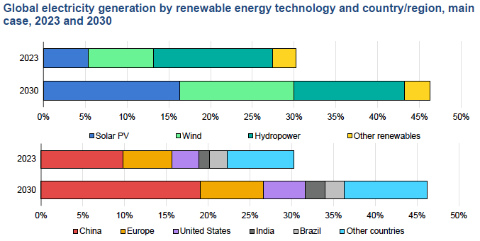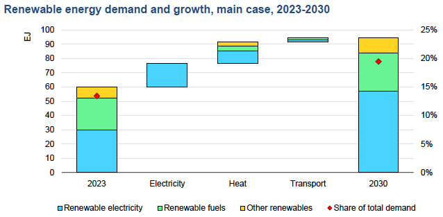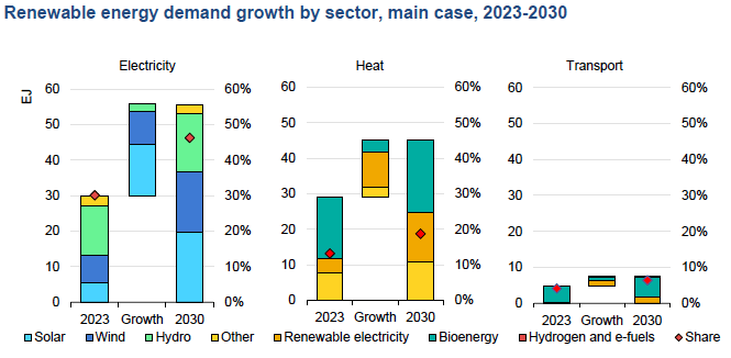 In the electricity sector, the renewable energy share is forecast to expand from 30% in 2023 to 46% in 2030. Solar and wind make up almost all this growth.