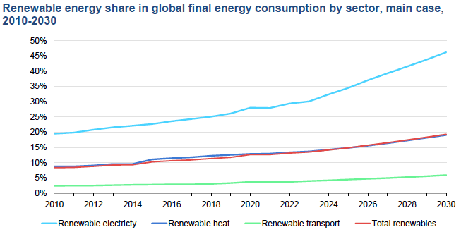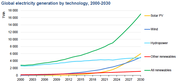 In 2030, variable renewables account for 2/3 of global renewable electricity generation (from less than 45% today). Over the forecast period, the share of solar PV in meeting global power demand 3x while wind almost 2x and the role of hydropower becomes less prominent.