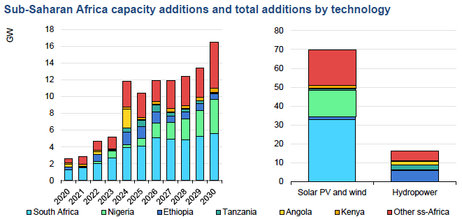 Outside of South Africa, hydropower makes up the majority of total additions: