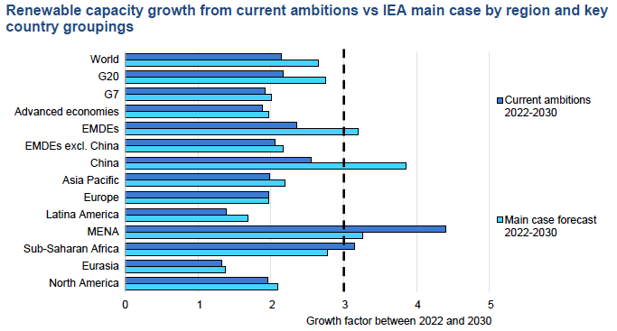 Accelerated case assumes govts address key policy, grid integration, financing, permitting challenges in short term to unlock ~20% more capacity compared with the main case, enabling an ~3x global renewable capacity by 2030.