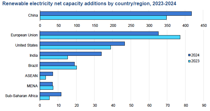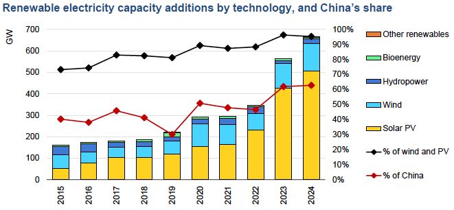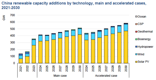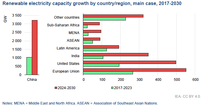 Over 2024-2030, China is expected to install 3,207 GW of new renewable