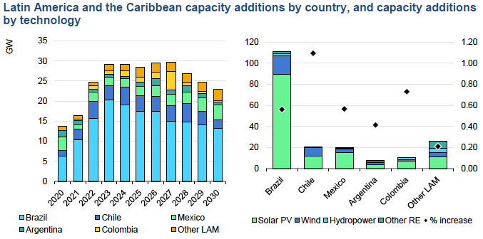 Latin America will add over 190 GW of renewable capacity, led by solar PV (72%) wind power (19%) and hydropower (5%).