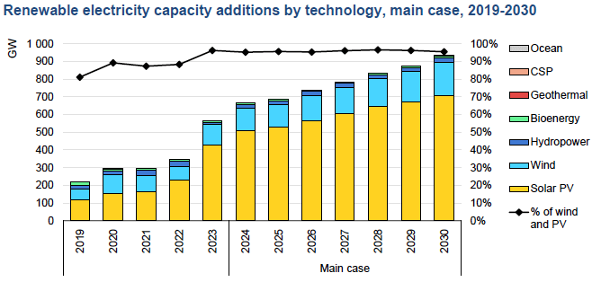 Global renewable capacity additions rise to ~935 GW in 2030. Solar PV, wind are account for 95% of all capacity additions through 2030 b/c generation costs are lower than for both fossil and non-fossil alternatives in most countries, and policies continue to support them.