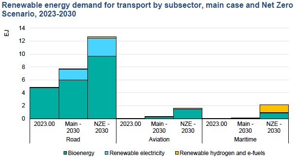 Current renewable energy demand forecasts for the road, marine and aviation subsectors fall short of the IEA Net Zero by 2050 Scenario trajectory. Among these, road transport is the closest to meeting the scenario’s targets.