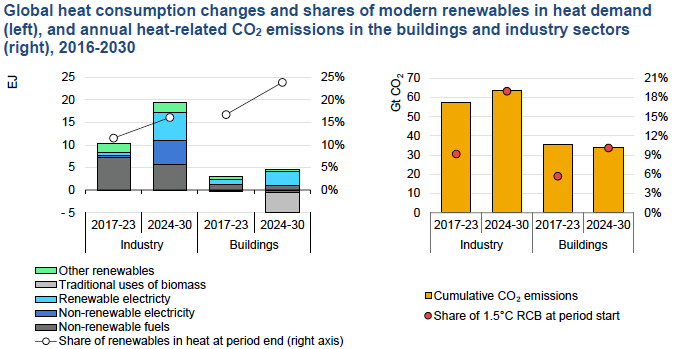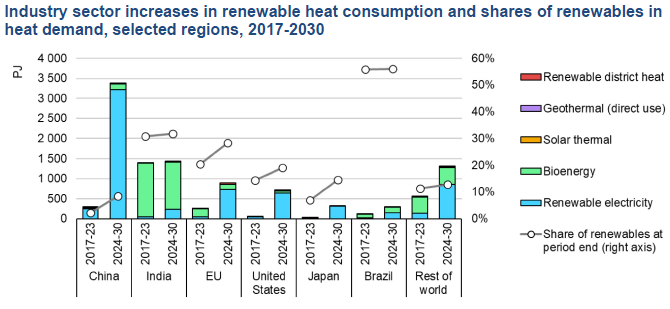 Industrial heat consumption is projected to grow 17% (+20 EJ) by 2030, with China and India accounting for over 50% of the increase. Renewable heat will represent less than half of this growth, with its share in industrial heat supply slowly increasing to 16%.