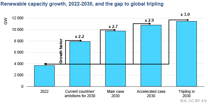 Capacity triples from 53 GW in 2023 to ~150 GW in 2030.